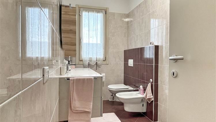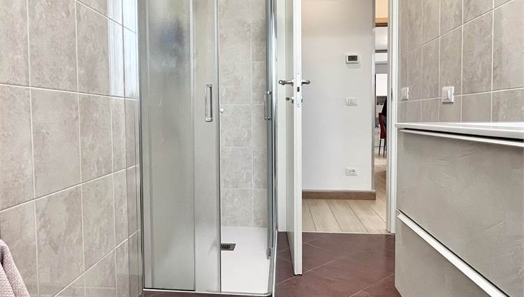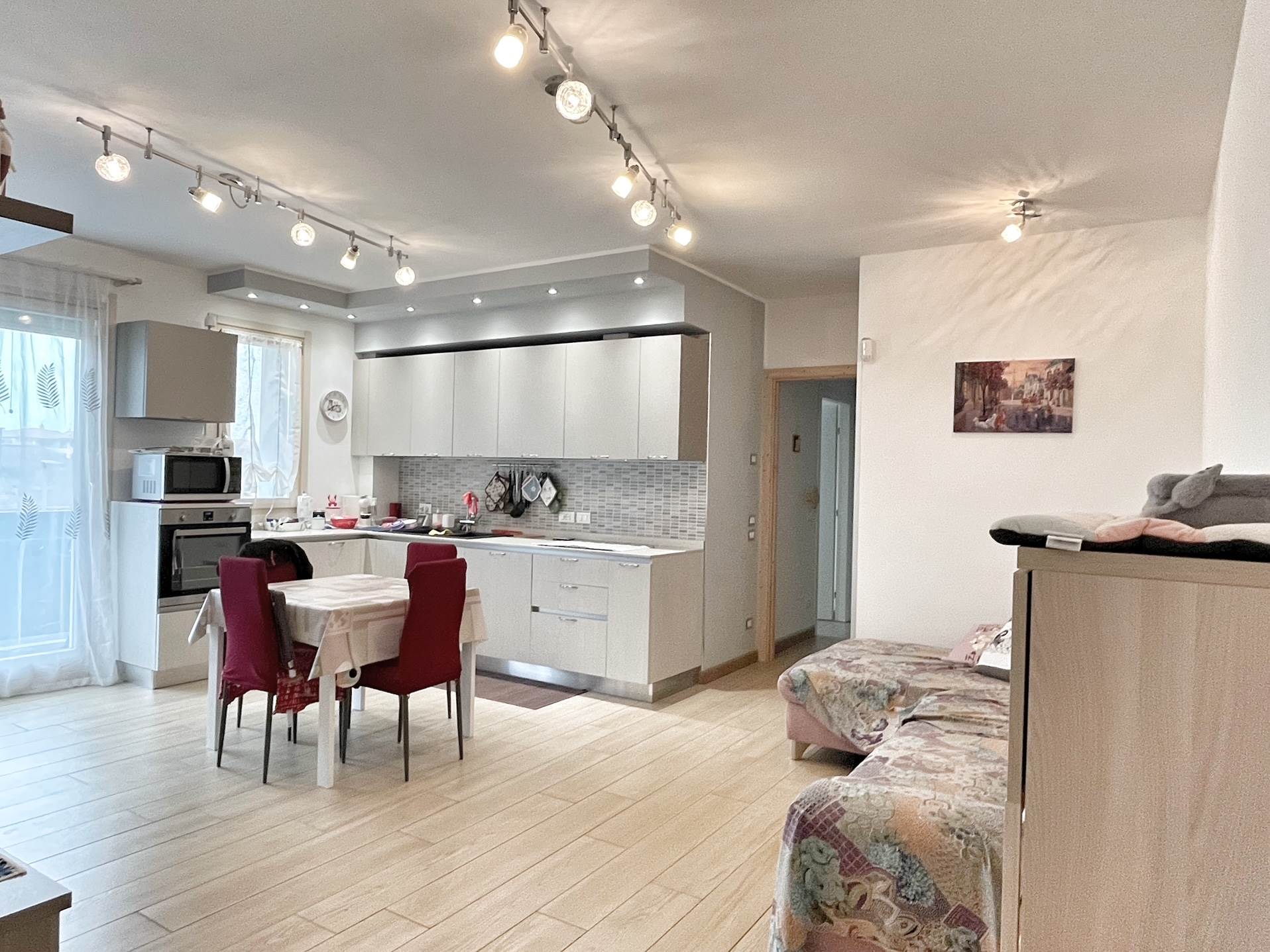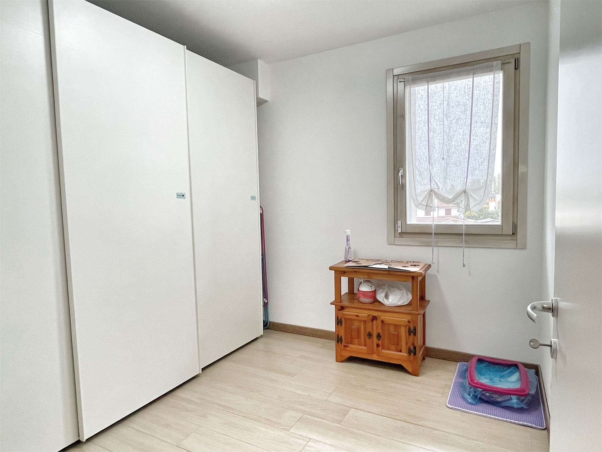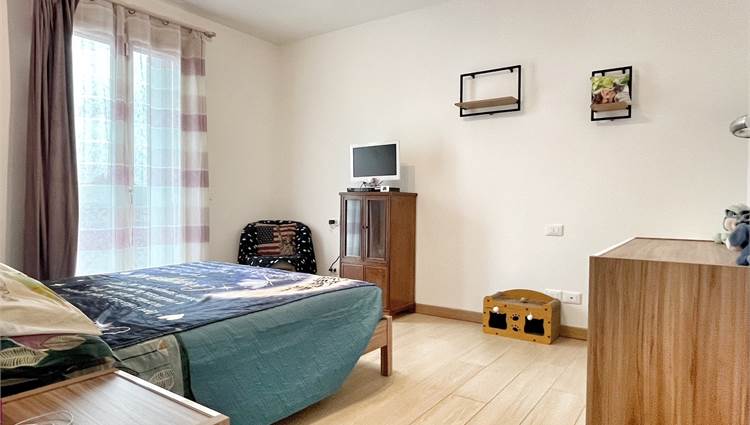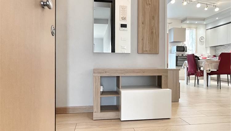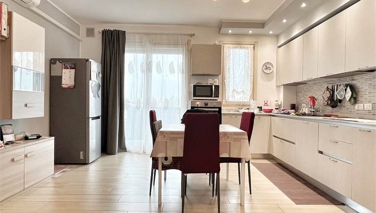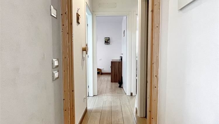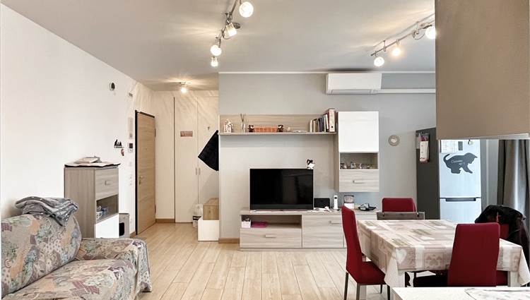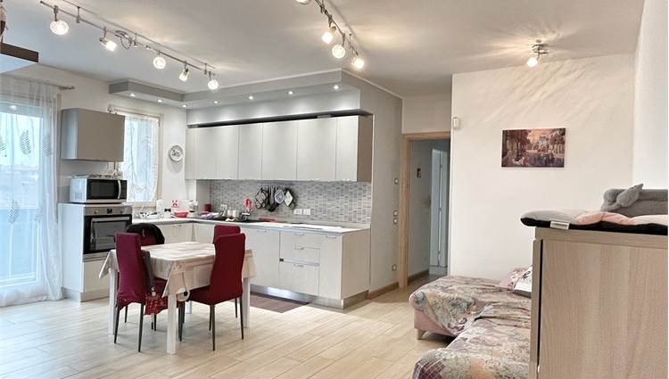 Luminoso appartamento con esposizione sud ovest. Zona giorno open space di 30 mq con uscita in terrazza di 15 mq, disimpegno, camera singola, camera matrimoniale con uscita nella stessa terrazza, bagno finestrato, angolo lavanderia e wc. Al piano terra garage e due posti auto. Completo di allarme, aria condizionata daikin nuova, panelli fotovoltaici individuali, riscaldamento a pavimento. Completamente arredato. Spese condominiali contenute.