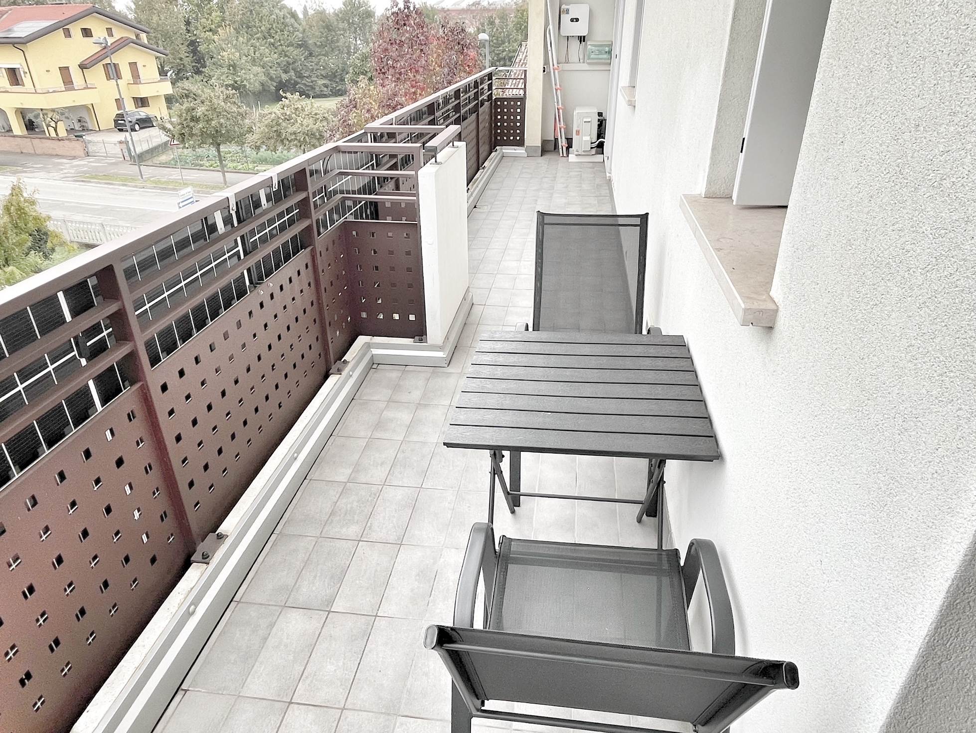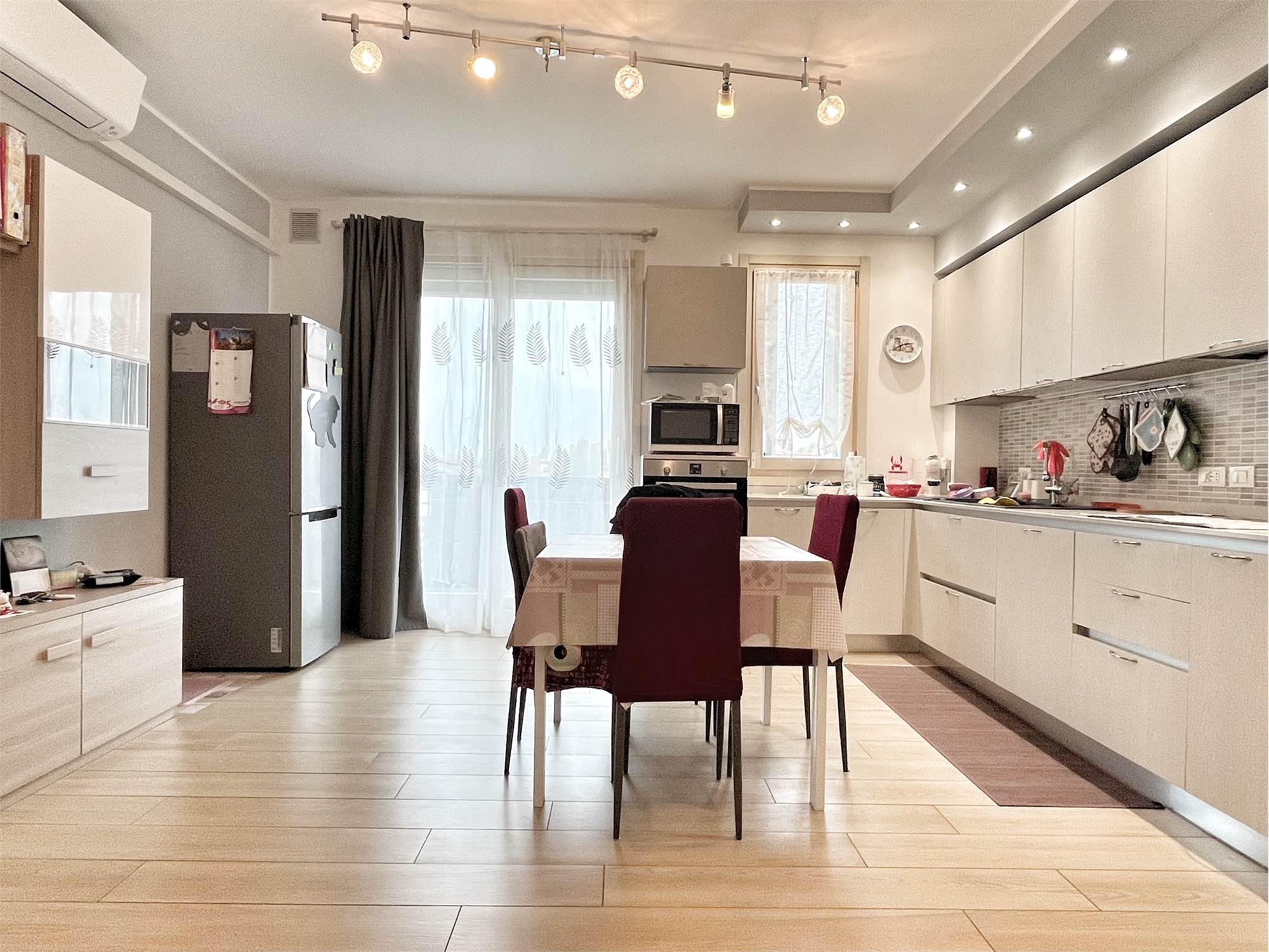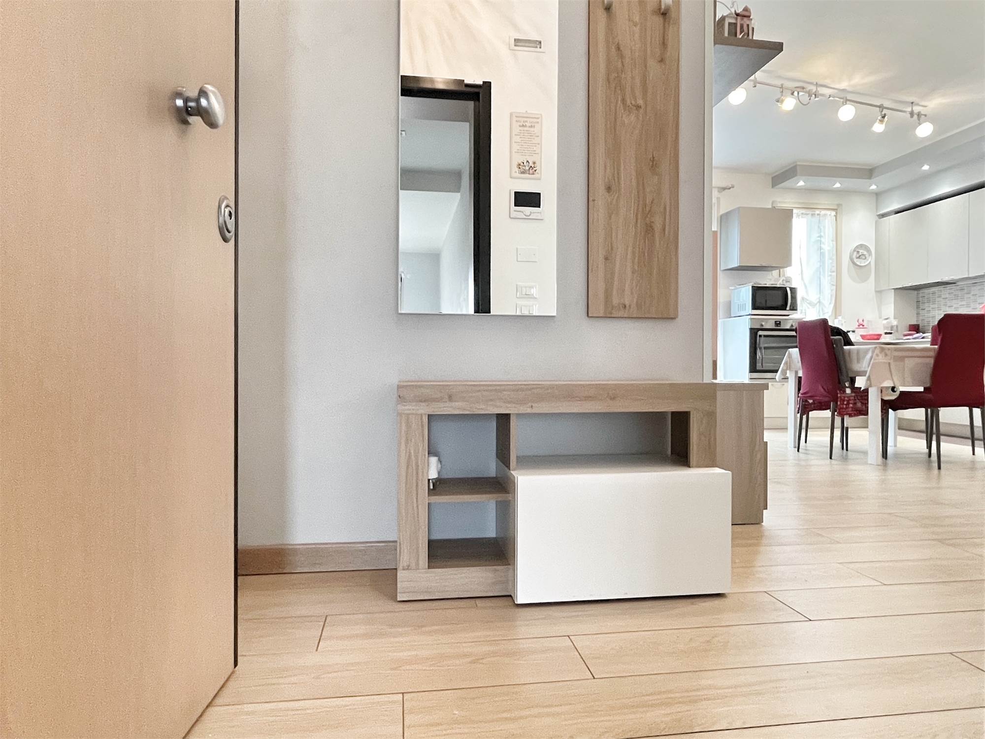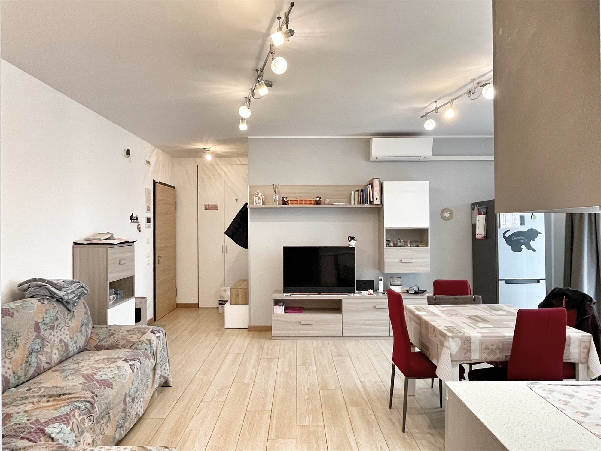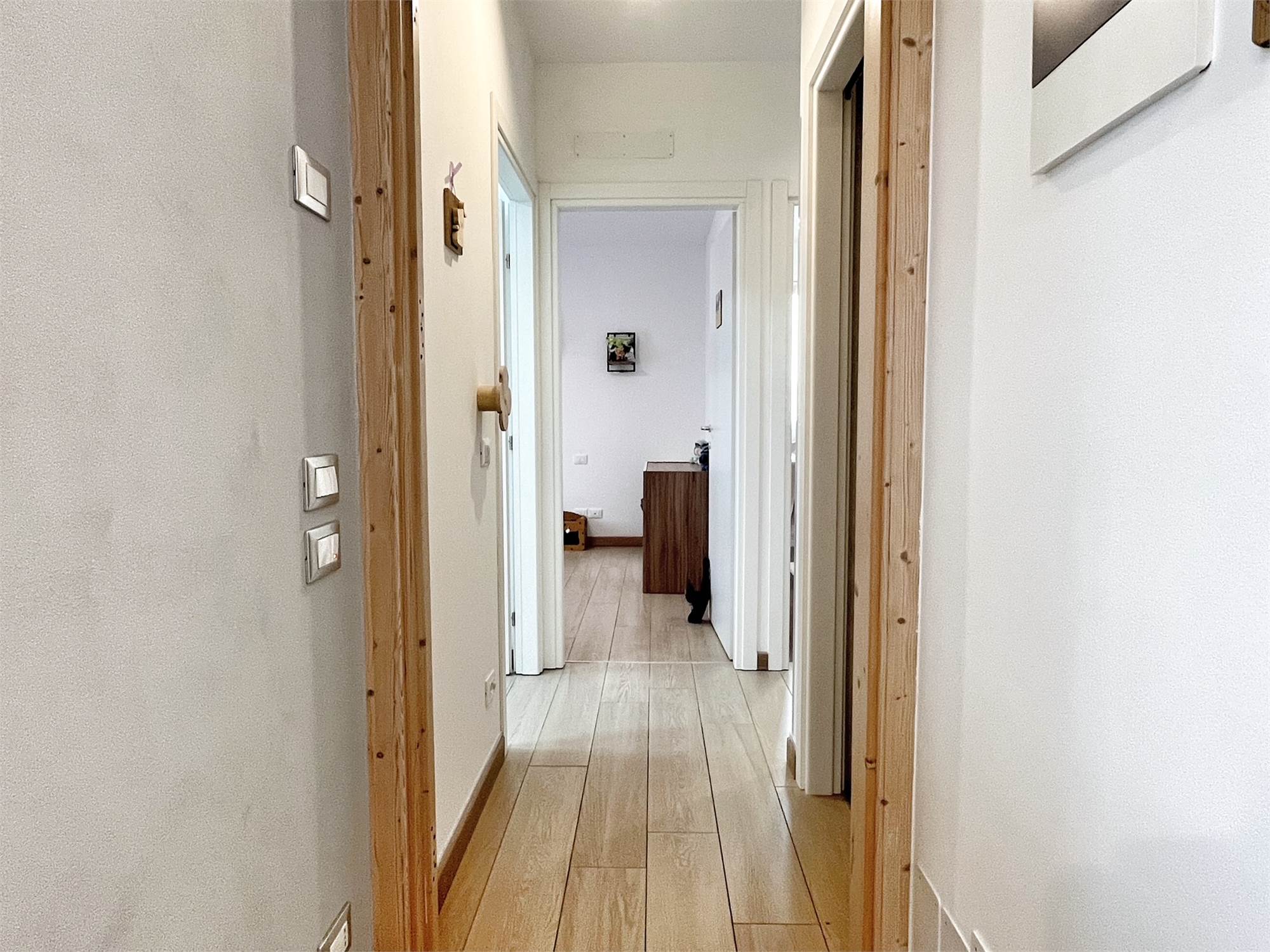 Luminoso appartamento con esposizione sud ovest. Zona giorno open space di 30 mq con uscita in terrazza di 15 mq, disimpegno, camera singola, camera matrimoniale con uscita nella stessa terrazza, bagno finestrato, angolo lavanderia e wc. Al piano terra garage e due posti auto. Completo di allarme, aria condizionata daikin nuova, panelli fotovoltaici individuali, riscaldamento a pavimento. Completamente arredato. Spese condominiali contenute.