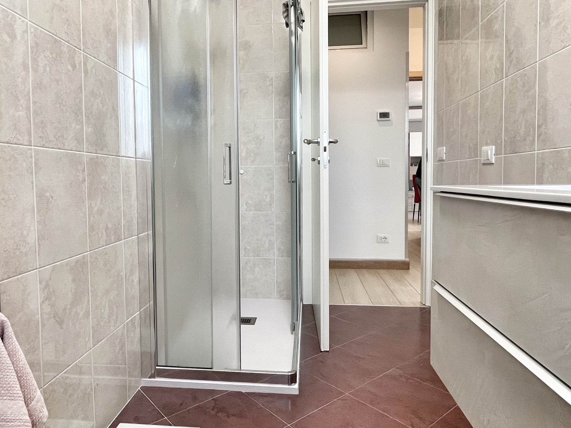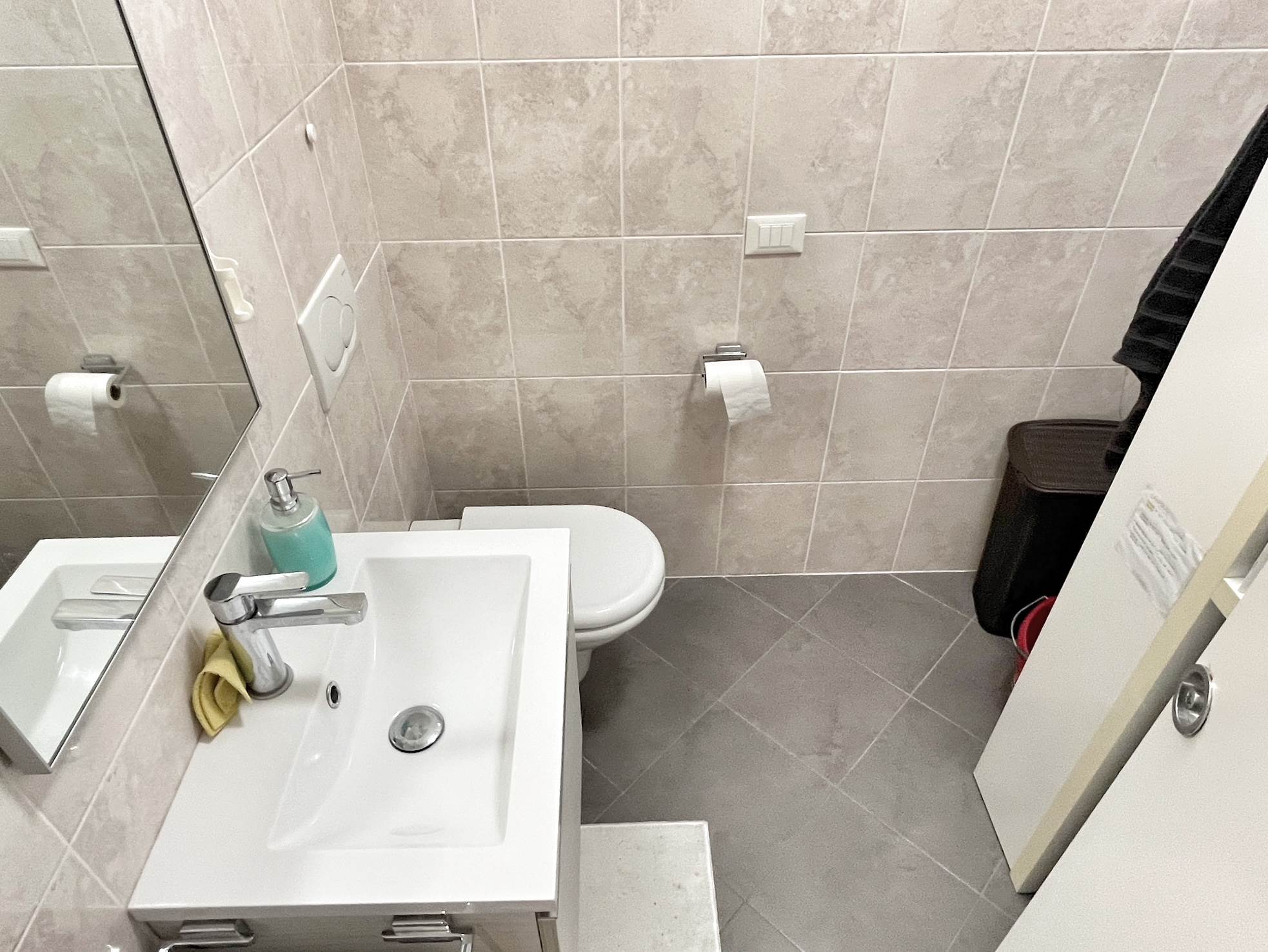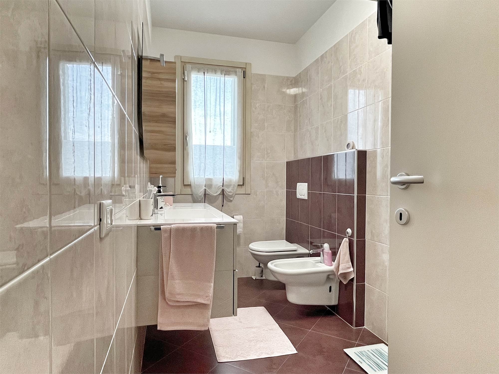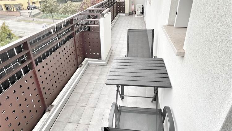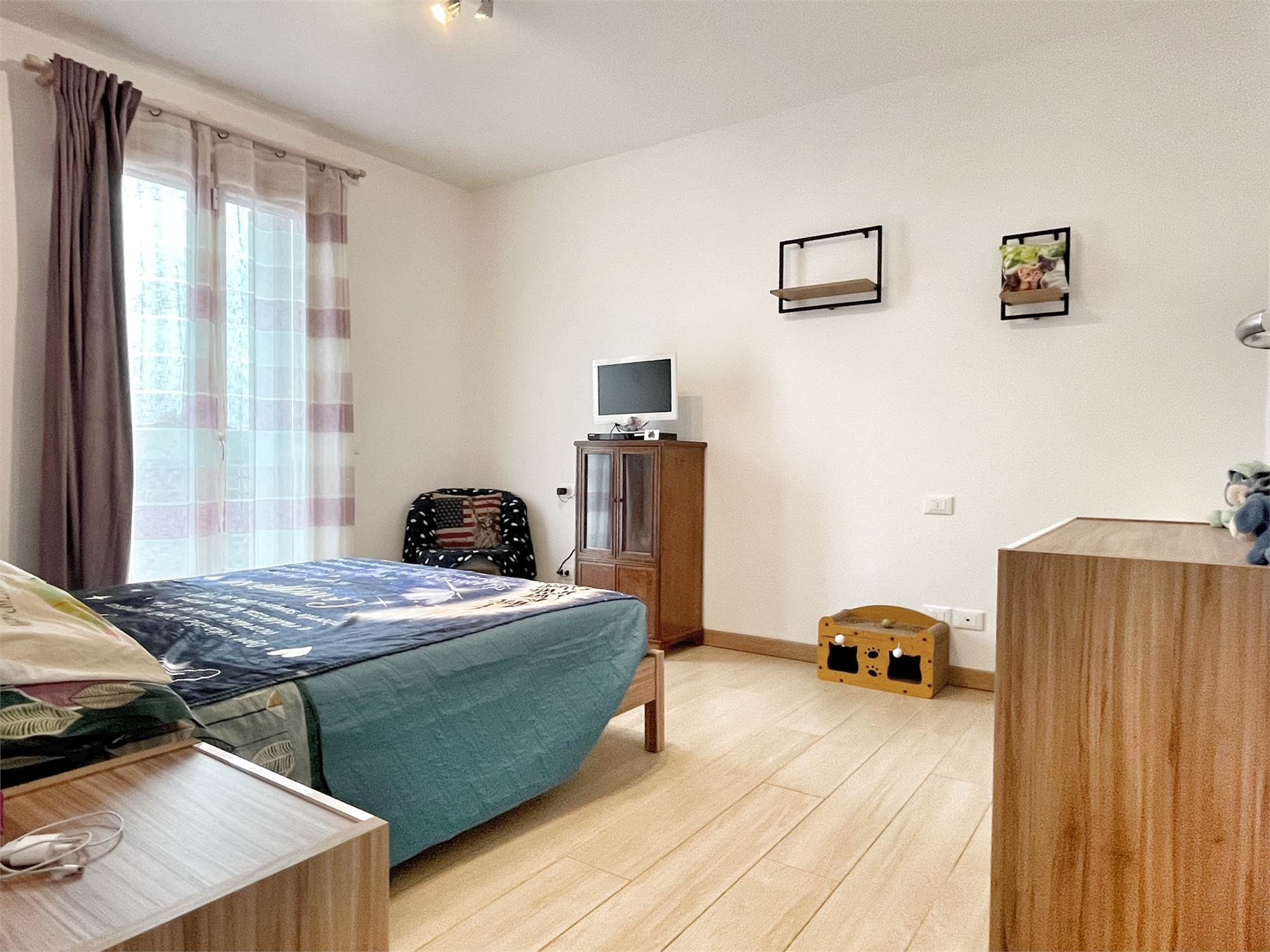 Luminoso appartamento con esposizione sud ovest. Zona giorno open space di 30 mq con uscita in terrazza di 15 mq, disimpegno, camera singola, camera matrimoniale con uscita nella stessa terrazza, bagno finestrato, angolo lavanderia e wc. Al piano terra garage e due posti auto. Completo di allarme, aria condizionata daikin nuova, panelli fotovoltaici individuali, riscaldamento a pavimento. Completamente arredato. Spese condominiali contenute.